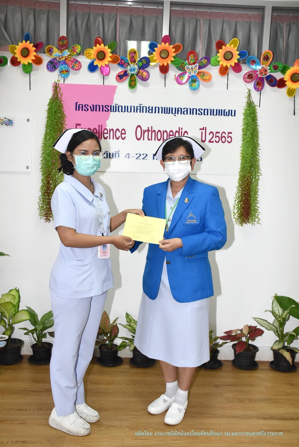 วันที่ 22 กรกฎาคม 2565 นางเสาวรส จันทมาศ รองผู้อำนวยการฝ่ายการพยาบาล รพ.มหาราชนครศรีธรรมราช เป็นประธานในพิธีมอบวุฒิบัตร การอบรมโครงการพัฒนาศักยภาพบุคลากรตามแผนงาน Excellence Orthopedic แบบ Online และ Onsite (ระหว่างวันที่ 4-22 กรกฎาคม 2565) เพื่อพัฒนาคุณภาพการดูแลผู้ป่วยออร์โธปิดิกส์ และพัฒนาบุคลากรทุกระดับให้มีความเชี่ยวชาญในการบริการด้านออร์โธปิดิกส์ สามารถให้การดูแลผู้ป่วยอย่างมืออาชีพ ณ อาคารศูนย์แพทยศาสตรศึกษาชั้นคลินิก
